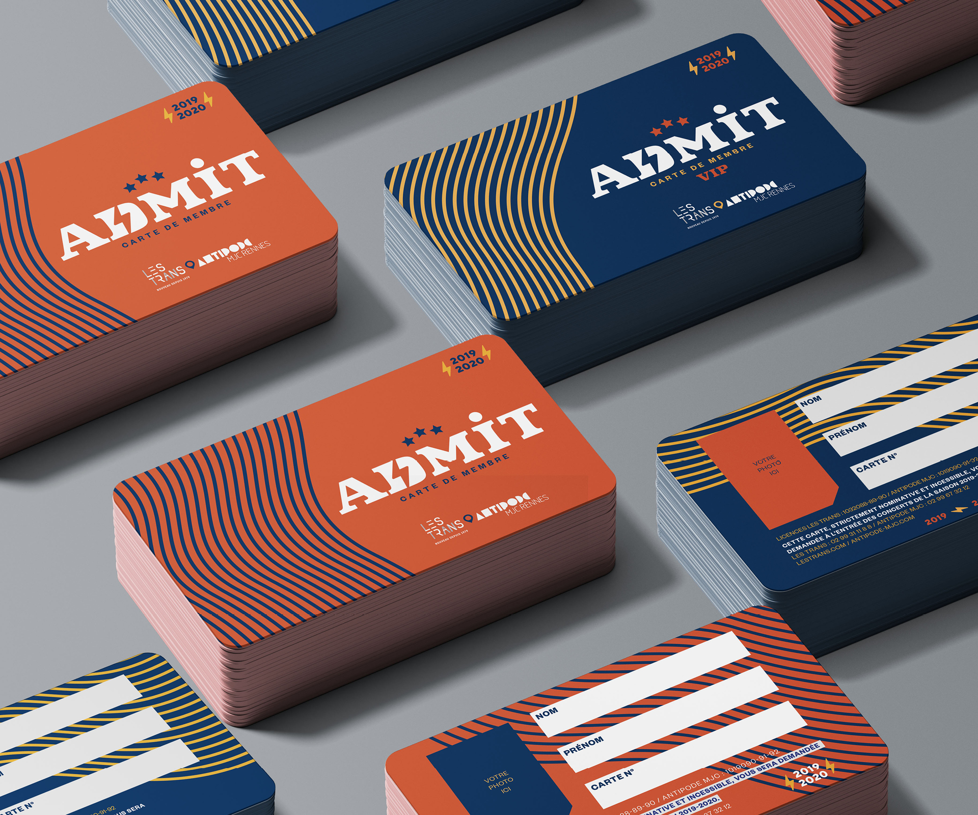 Direction artistique du Pass Admit, carte d’abonnement donnant accès à de nombreux avantages quant à des évenemenrts culturels dans le Grand Ouest. Offre proposé par l’Antipode et les Transmusicales de Rennes.